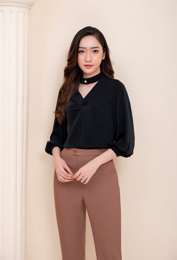 Thiết kế áo kiểu được làm từ chất liệu lụa trơn. Độ dài áo vừa phải. Dáng áo suông. Tay áo lửng, ống tay được bo chun. Cổ dáng chữ V phối chi tiết cổ rời đính trai