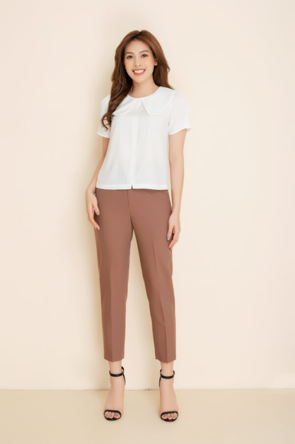 Áo dáng lửng cổ sen, tay ngắn hơi phồng nhẹ. Màu sắc đơn giản thanh lịch phù hợp môi trường công sở.