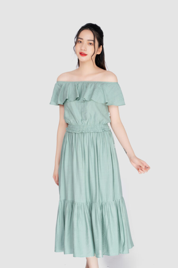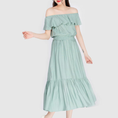 Set đồ bao gồm áo croptop và chân váy xòe dài. Áo dáng crop bo chun, trễ vai có bèo. Chân váy cạp cao, nhún eo 2 tầng, tùng váy xòe nhẹ, chân váy dài qua đầu gối. Set đồ được làm từ chất liệu vải thôi mềm, mát, có độ nhăn nhẹ.