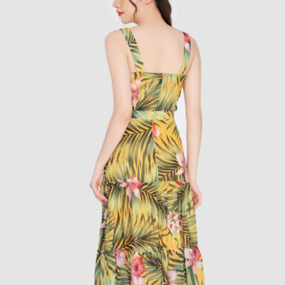 Đầm maxi 2 dây bản to, eo chiết bản to. Tùng váy xếp lớp tạo xòe. Cài bằng khóa kéo ẩn sau lưng. Vải họa tiết mùa hè