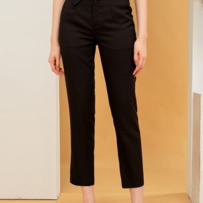 Quần dài ống đứng. Cạp cao có đỉa. 2 túi chéo và 2 viền túi giả phía sau. Có đai rời kèm theo quần